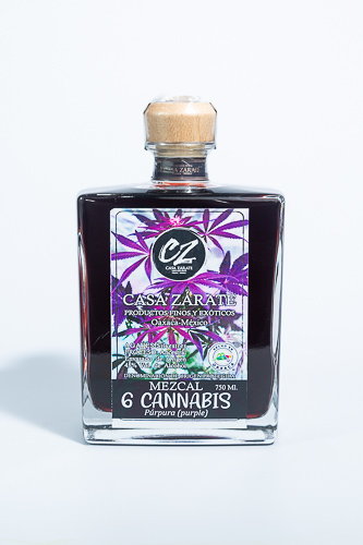 Mezcal ancestral de agave Espadín silvestre con 6 cannabis verde, 3 procesos (destilación, maceración y adición de aceite de cannabis con cbd y thc) 3 años de barrica y 2 años de botella de vidrio)
