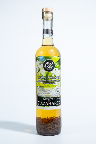Mezcal ancestral de agave Espadín silvestre con 7 azahares, destilado y macerado, 3 años de barrica y 2 años de botella de vidrio